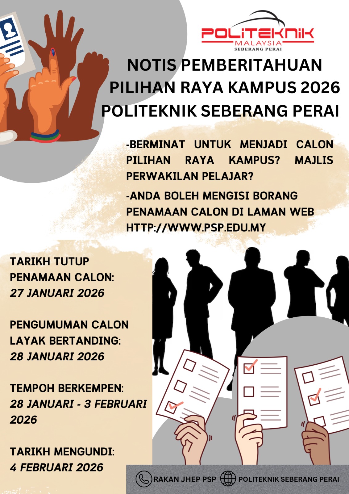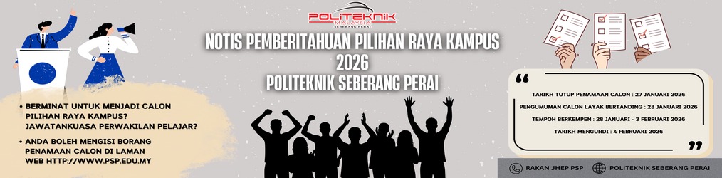 PILIHAN RAYA KAMPUS (PRK) TAHUN 2026 POLITEKNIK SEBERANG PERAI📢 Pendaftaran Pelajar Senior PSP Sesi II 2025/2026Kepada semua pelajar senior, sila rujuk Surat Makluman Pendaftaran Pelajar Senior dalam bentuk PDF untuk info lanjut berkaitan proses pendaftaran.